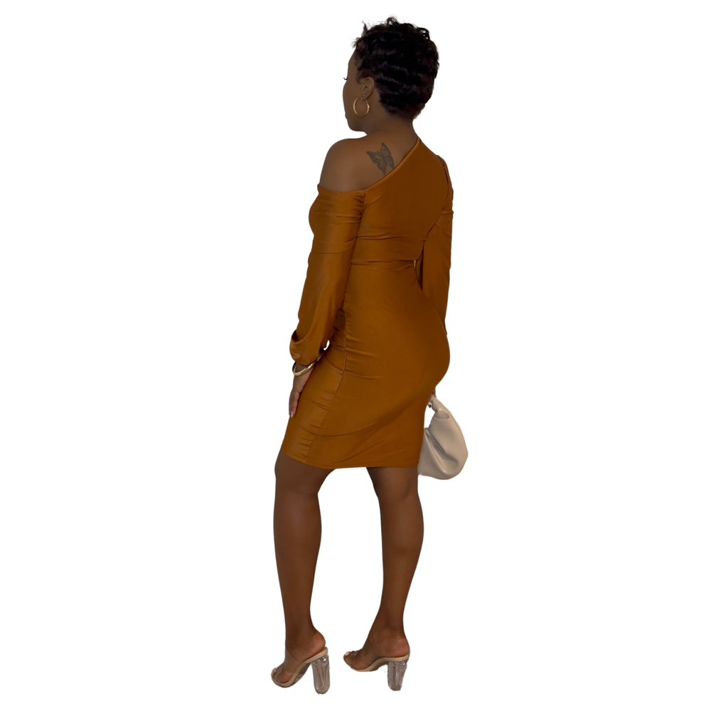Make a bold entrance in the Solana Midi Dress, designed for the woman who moves with purpose. Featuring an asymmetric one-shoulder neckline and a dramatic lantern sleeve, this figure-hugging silhouette brings elegance and edge together in one statement look. The rich rust tone adds warmth, making it perfect for seasonal transitions or standout events. Crafted with stretch for a flattering fit that hugs in all the right places.